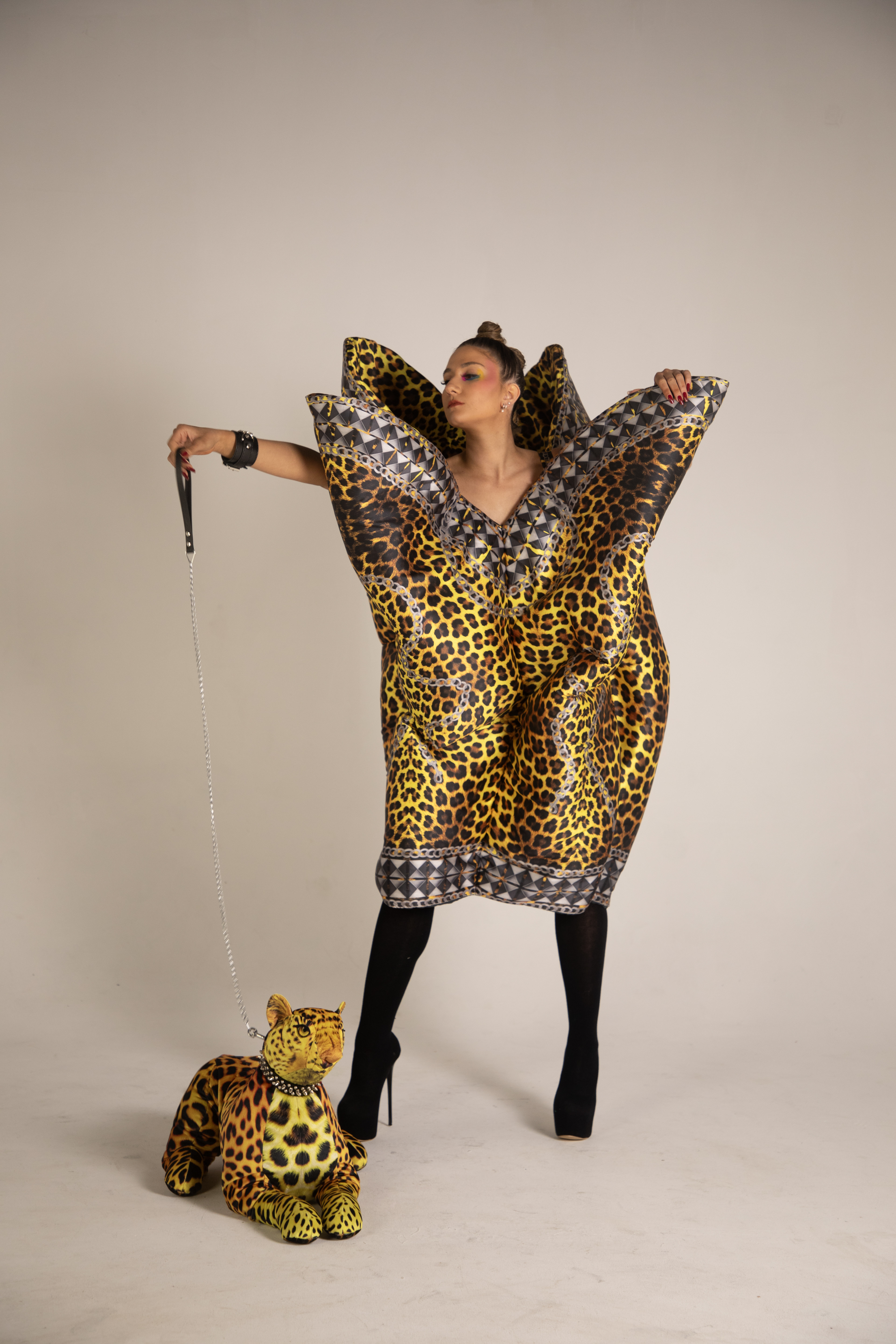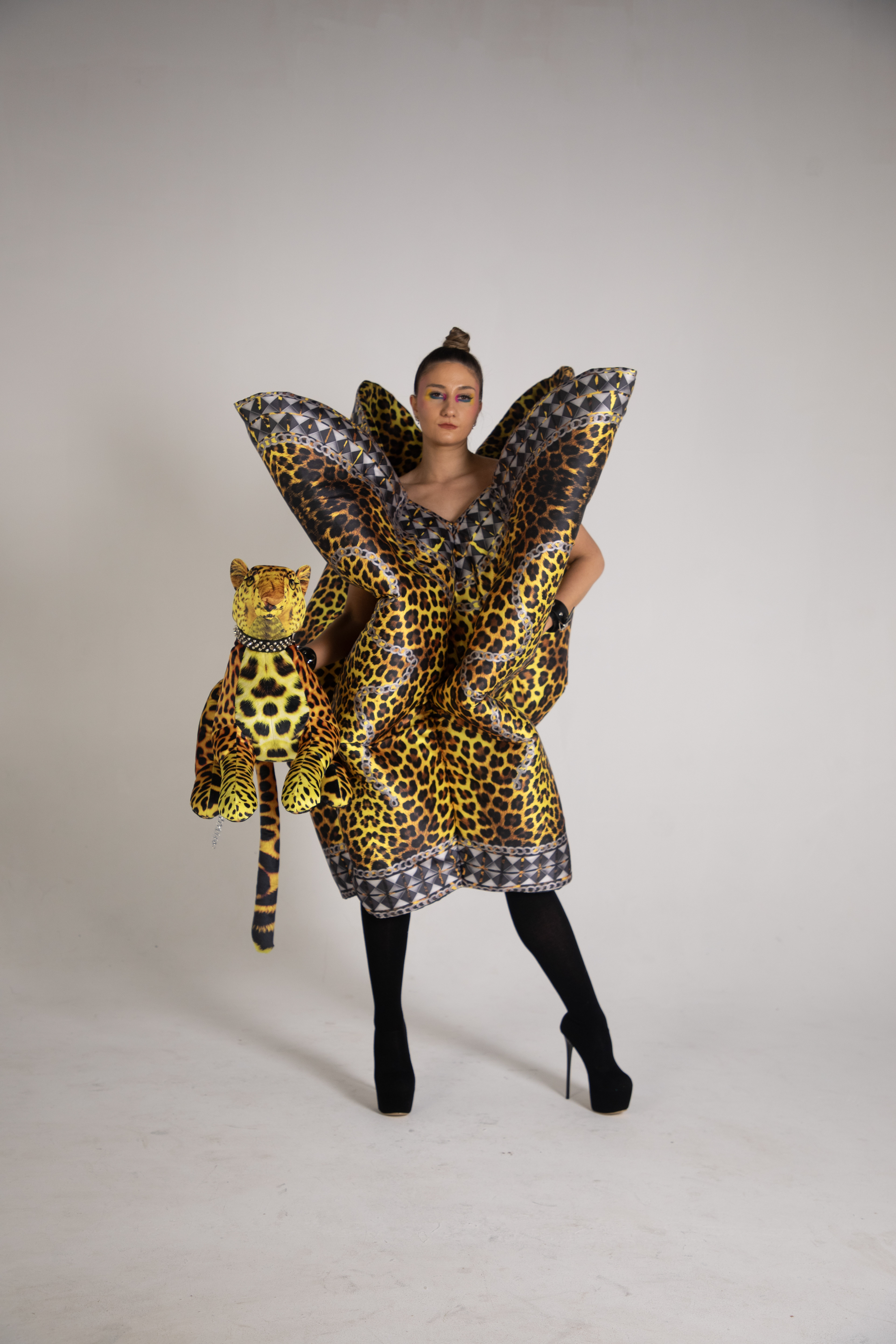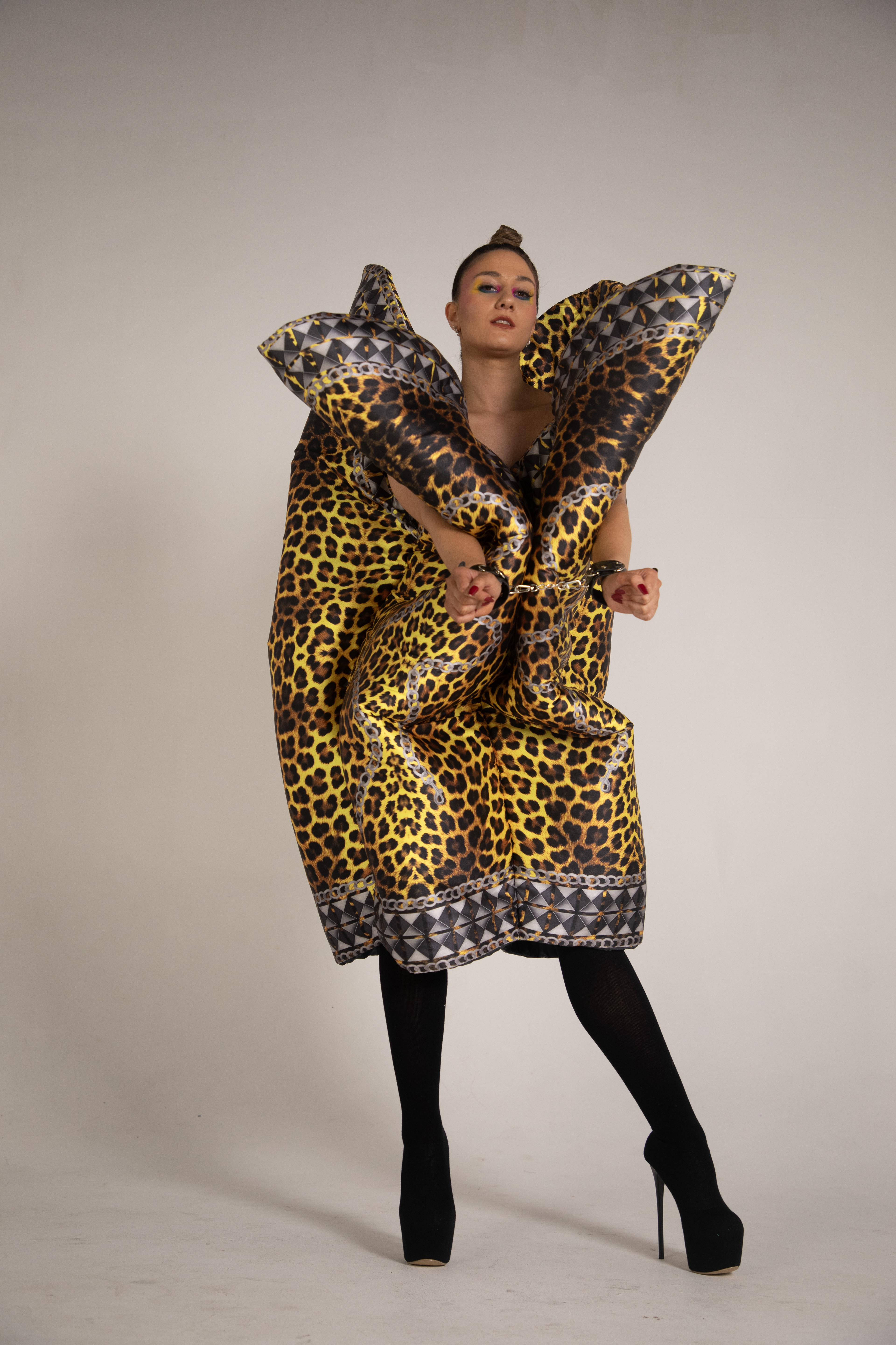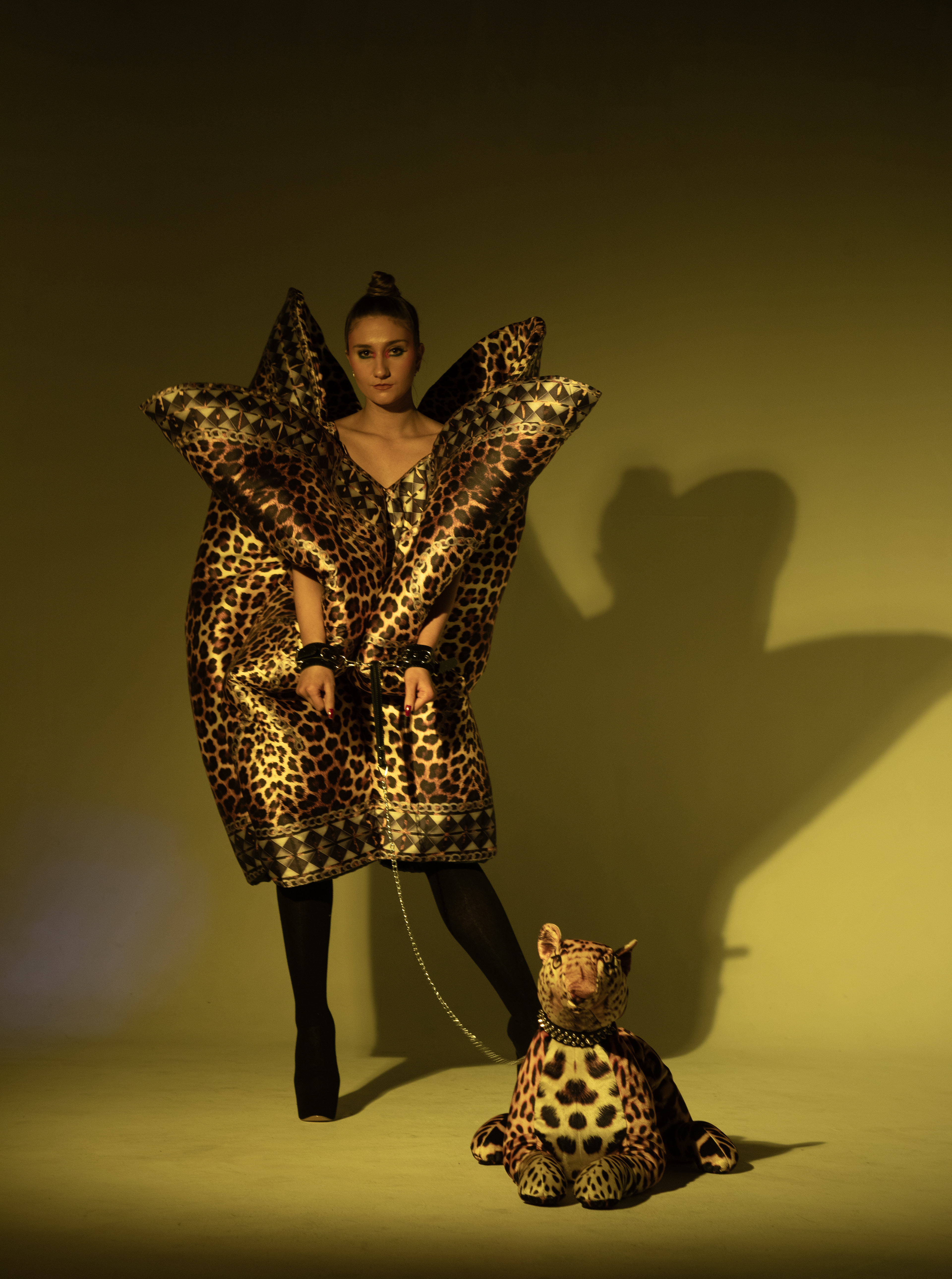 “Round 2“ is a revolutionary fashion collection that redefines the relationship between power, femininity, and couture. At its heart are seven distinctive bodies, each embodying a unique narrative that challenges traditional norms and invites a bold exploration of identity. Each look is anchored with the striking pattern of leopard print and meticulously placed sex toys. These qualities are an emblem of sophistication and authority that unveils a vibrant, attention-grabbing dress that bursts with character and colour, symbolising the liberation of self-expression.