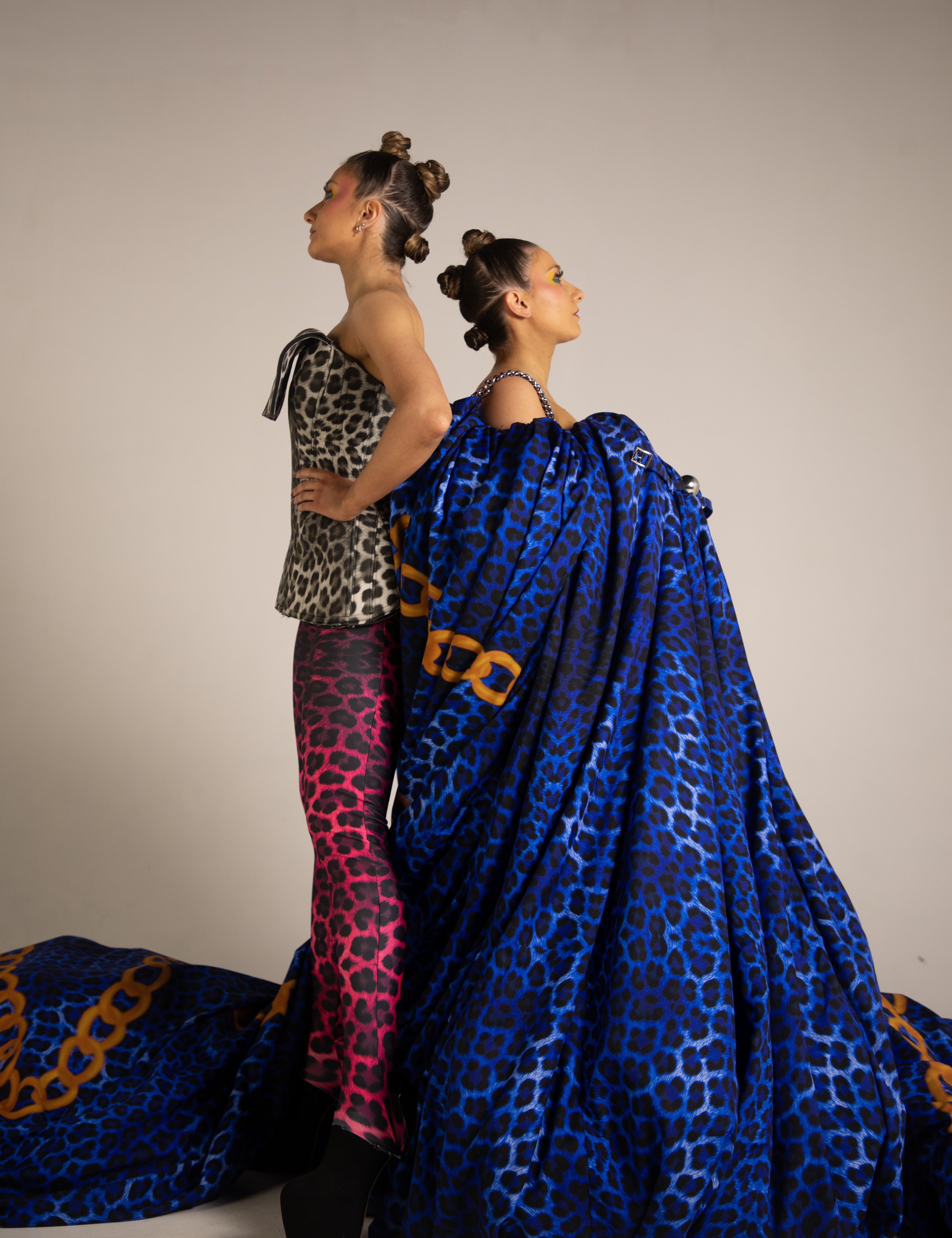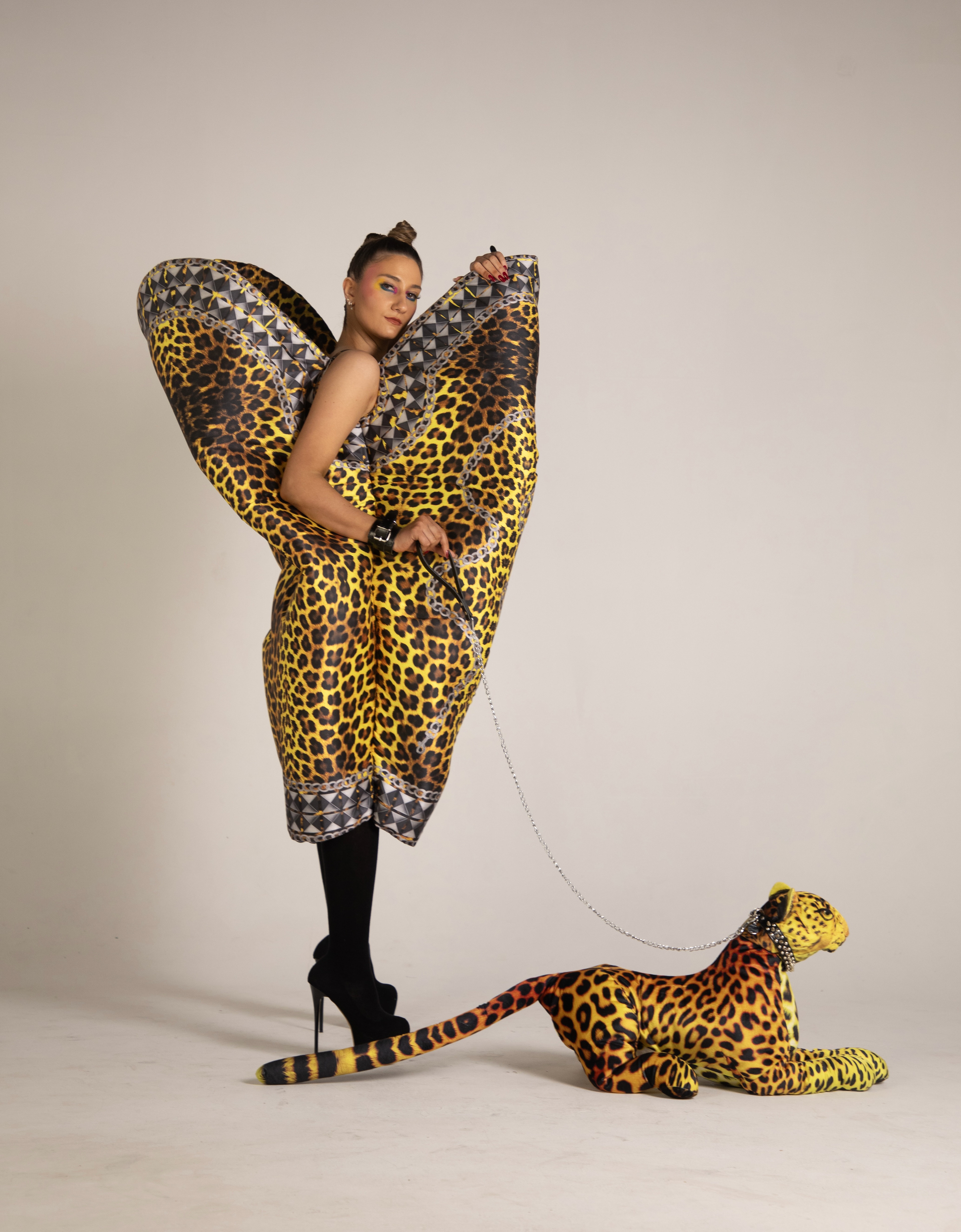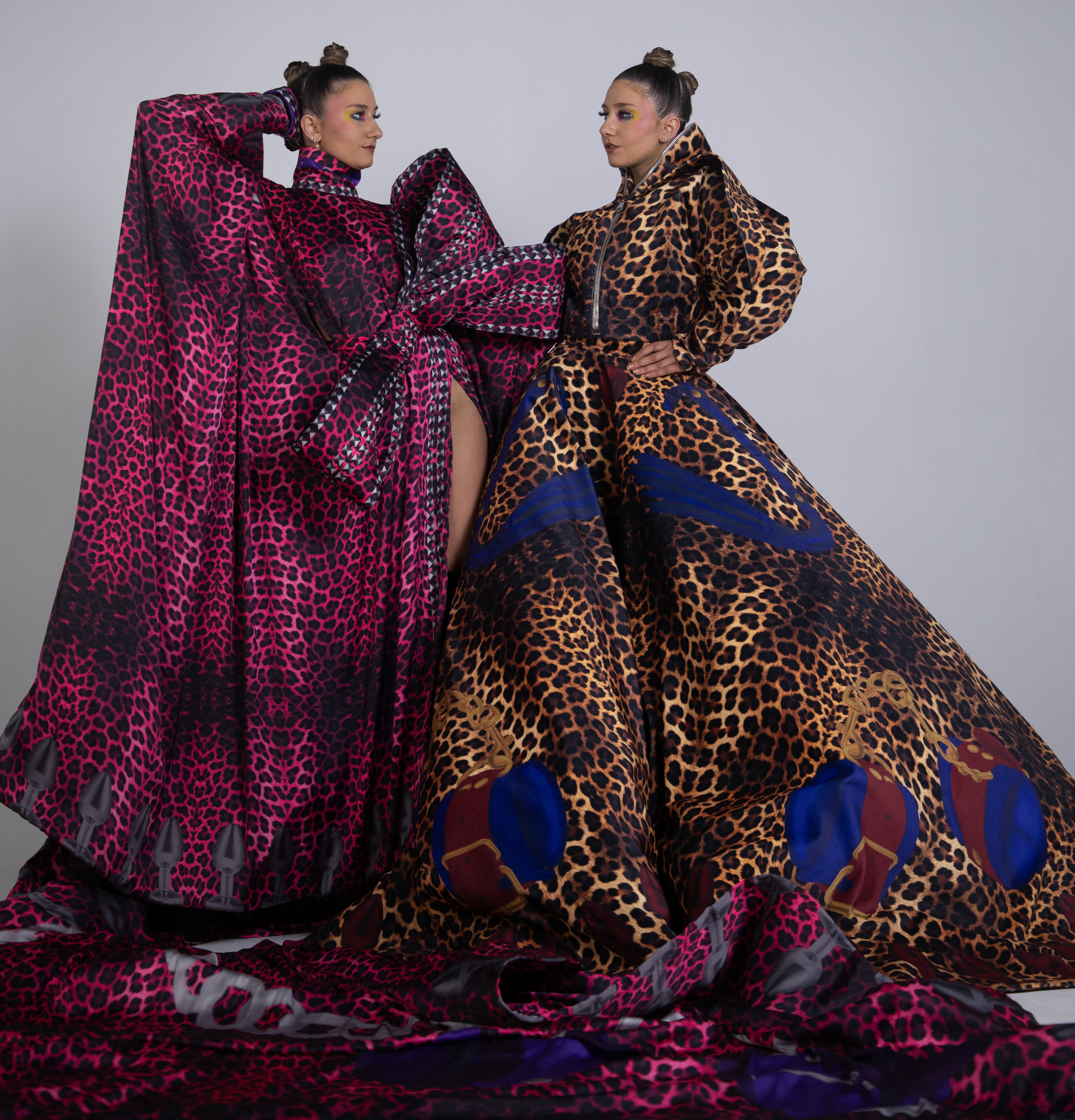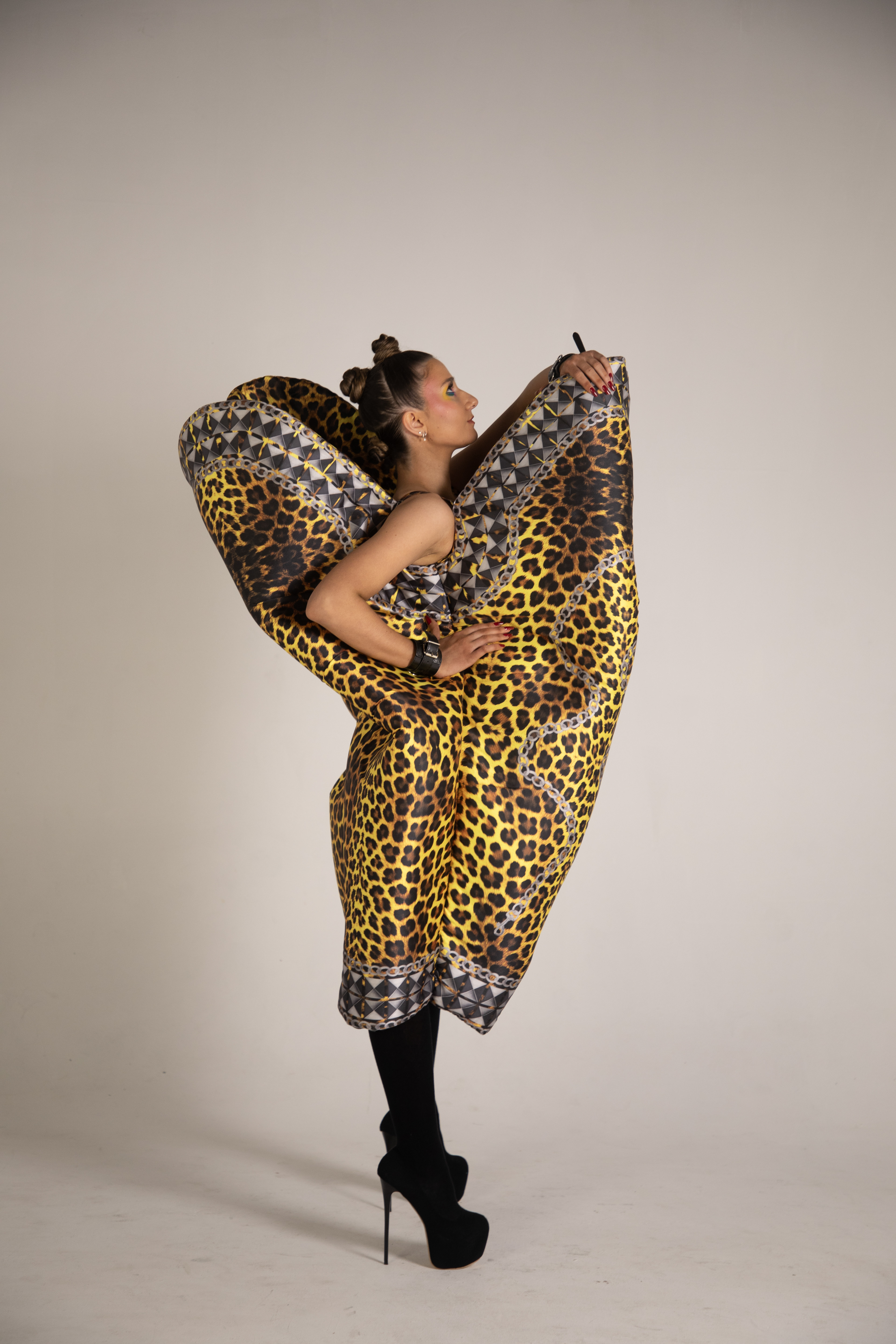 “Round 2“ is a revolutionary fashion collection that redefines the relationship between power, femininity, and couture. At its heart are seven distinctive bodies, each embodying a unique narrative that challenges traditional norms and invites a bold exploration of identity. Each look is anchored with the striking pattern of leopard print and meticulously placed sex toys. These qualities are an emblem of sophistication and authority that unveils a vibrant, attention-grabbing dress that bursts with character and colour, symbolising the liberation of self-expression.